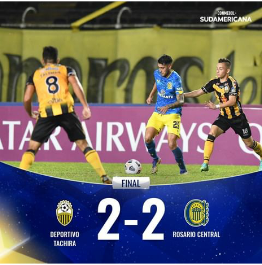 Rosario Central empató 2 a 2 con Deportivo Táchira de Venezuela, de visitante, en el estadio Polideportivo de Pueblo Nuevo, por la ida de los octavos de final de la Copa Sudamericana 2021.
