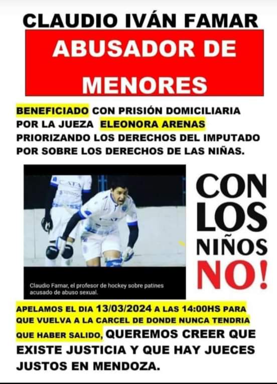 Claudio Famar de 32 años, entrenador y jugador de hockey sobre patines del Club Godoy Cruz Antonio Tomba, le otorgaron el beneficio de la prisión domiciliaria en la causa que lo tiene acusado por seis posibles abusos sexuales a alumnas de entre 10 y 12 años. La medida la realizó la jueza Eleonora Arenas, quien aprobó el pedido de la defensa sobre un arresto en una vivienda, para que salga de la cárcel.