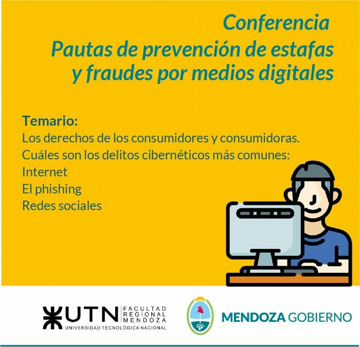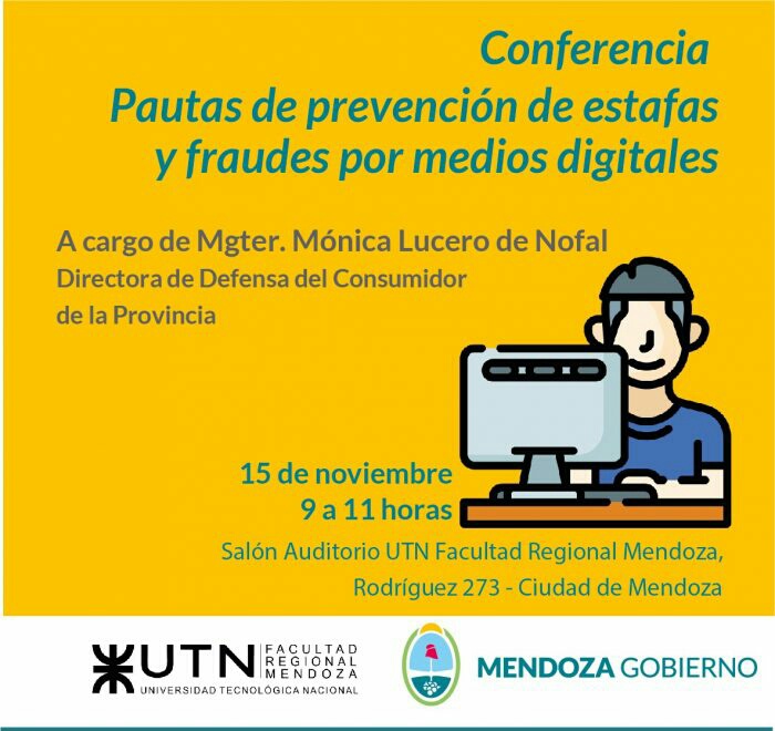 El miércoles 15 de noviembre, de 9 a 11, se realizará la conferencia sobre “Pautas de prevención de estafas y fraudes por medios digitales”. Será en el Salón Auditorio en la Universidad Tecnológica Nacional Facultad Regional Mendoza (UTN), Rodríguez 273 de la Ciudad de Mendoza. La capacitación está destinada al público general con inscripción previa a través del siguiente formulario https://forms.gle/DLSS5H2NL2JSUqSbA