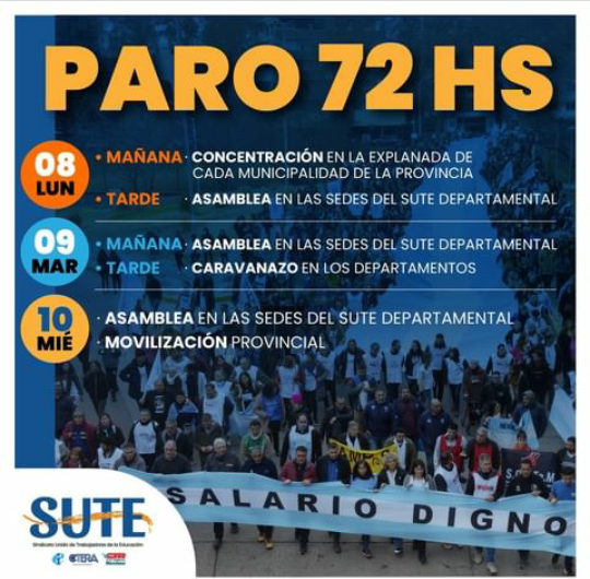 La semana anterior, en plenario general, el gremio votó para la medida de fuerza que se extenderá por tres días. El SUTE había rehuzado previamente que el Ejecutivo avanzar unilateralmente con el incremento y, con el paro, apuntará a que se reabran los debates