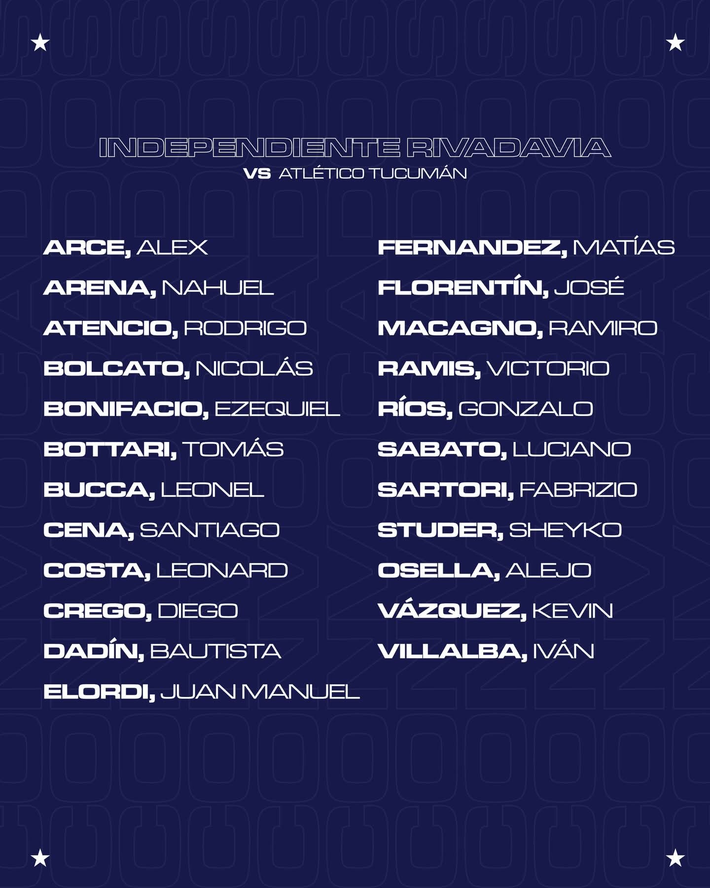 Independiente Rivadavia: Nicolás Bolcato; Alejo Osella, Iván Villalba, Leonard Costa, Sheyko Studer