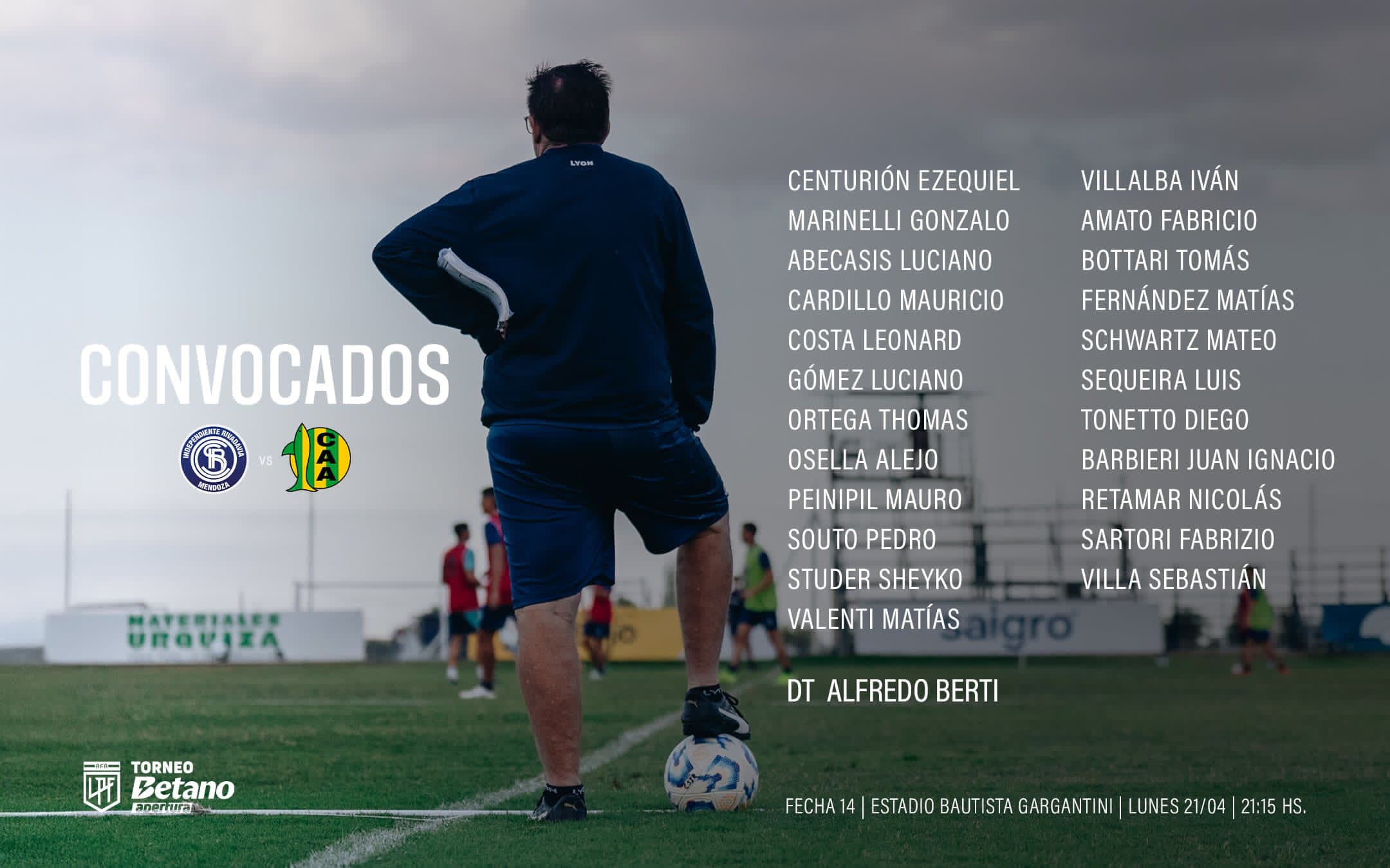 El once probable para recibir a Aldosivi sería: Maximiliano Centurión en el arco; Alejo Osella, Iván Villalba, Sheyko Studer, Thomas Ortega; Mauricio Cardillo, Tomás Bottari, Matías Fernández; Leonardo Sequeira; Sebastián Villa, Juan Barbieri o Fabrizio Sartori.