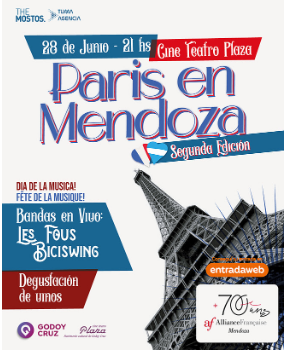 Una velada mágica llega a Mendoza. El sábado 28 de junio, a las 20 h, el Cine Teatro Plaza ( Colón 27, Godoy Cruz ) se transforma en un rincón parisino para celebrar el "Día de la Música" con la segunda edición de "París en Mendoza". Les Fous y Biciswing, dos referentes del swing y el gypsy jazz local, compartirán escenario en un espectáculo que combina melodías francesas, identidad mendocina y una previa con vinos para deleitar los sentidos.