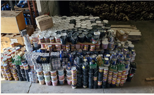 Durante el procedimiento, se incautaron grandes cantidades de productos químicos peligrosos. Entre los elementos secuestrados se encontraban 212 baldes de 20 litros, 430 de 10 litros, 540 de 4 litros y 108 de un litro, además de 40 botellas de 950 cm³ que podrían contener thinner. También fueron decomisadas cajas con recipientes de entonadores, tanto llenos como vacíos, y varios envases de pintura con etiquetas de marcas reconocidas pero que no correspondían a sus productos originales, lo que sugiere la posible adulteración de los contenidos.