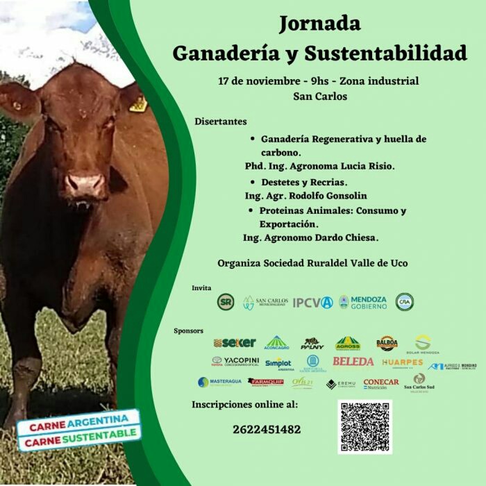 El Ministerio de Economía y Energía, a través de la Subsecretaría de Agricultura y Ganadería, invita a participar en la jornada de Ganadería y Sustentabilidad. Este espacio es impulsado por la Sociedad Rural del Valle de Uco, la Municipalidad de San Carlos, el Instituto de la Promoción de la Carne Vacuna Argentina (IPCVA) y Confederaciones Rurales Argentinas (CRA).