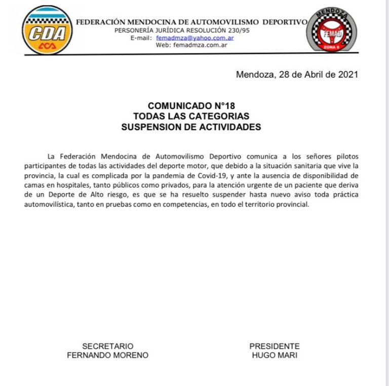 El automovilismo estará en boxes hasta nuevo aviso. Después de la tercera fecha del Zonal Cuyano en San Juan, y teniendo en cuenta que la siguiente contienda sería en nuestra provincia, la Federación Mendocina de Automovilismo Deportivo (FEMAD) dio un escrito para avisar que para todas sus actividades.
