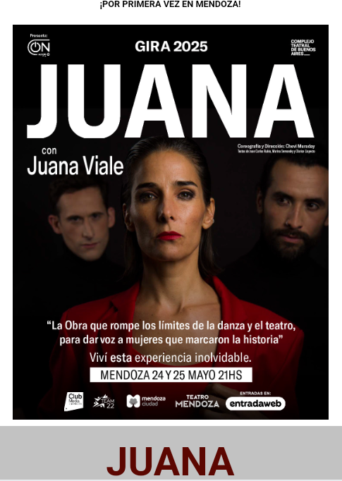 Por primera vez en Mendoza, la actriz Juana Viale presenta su aclamada obra “Juana”. La pieza que une el teatro y la danza comienza una gira nacional y tendrá dos funciones únicas, el sábado 24 y domingo 25 de mayo, en el Teatro Mendoza de Ciudad. Las entradas están disponibles enEntradaweb.com.ar.