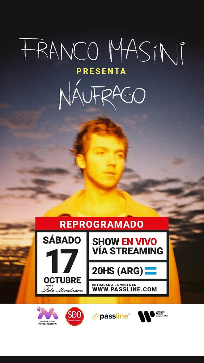 Por cuestiones inherentes a la pandemia, ajenas al artista, con motivo de preservar el cuidado de las personas que trabajan en el show y para poder dar estricto cumplimiento al protocolo y las normativas en seguridad sanitaria, se decidió reprogramar el show en vivo vía streaming de Franco Masini para el sábado 17 de octubre a las 20 hs (ARG).