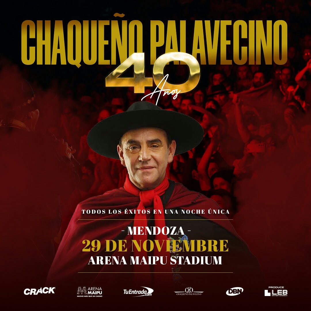 Uno de los referentes del folclore nacional vuelve a Mendoza. El Chaqueño Palavecino anunció su Gira 40 años, con la que celebrará su extensa trayectoria en todo el país. Y el viernes 29 de noviembre, brindará un concierto histórico en el Arena Maipú Stadium. La preventa de entradas comienza el lunes 3 de junio, por Tuentrada.com, Maxi Mall y boletería el Arena.