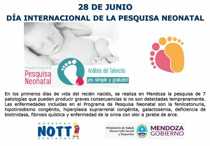 El Programa Provincial de Pesquisa Neonatal, el Centro de Prevención Enfermedades Inaparentes de la Infancia, el Departamento de Bioquímica del Hospital Pediátrico Dr. Humberto Notti, la Dirección de Prevención y Promoción de la Salud y la Subsecretaría de Planificación y Coberturas Públicas Sanitarias del Ministerio de Salud, Desarrollo Social y Deportes de Mendoza recordaron que el 28 de Junio se conmemora el Día Internacional de la Pesquisa Neonatal”.