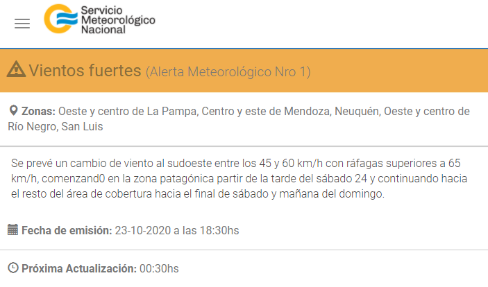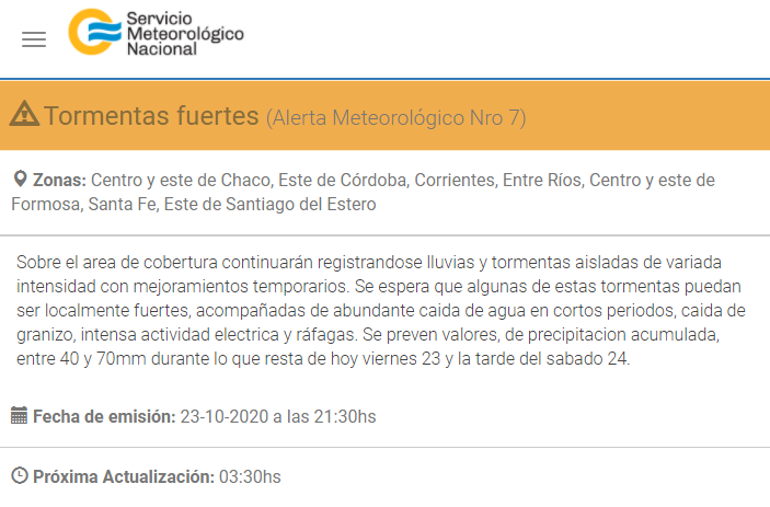 El horario comprendido es 18.30 del sábado 24 de octubre y las 03.30 del domingo 25 de octubre en varias regiones del país incluido la alta posibilidad de caída de granizo.