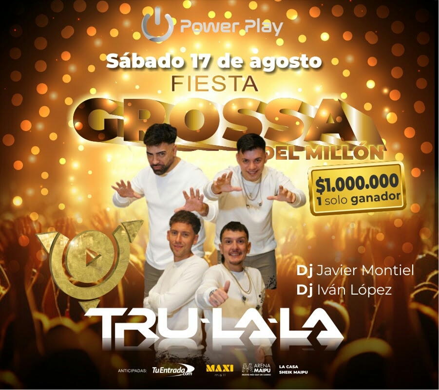 La Fiesta Grossa del Millón llega el próximo sábado 17 de agosto, a las 22 horas, en el Stadium Arena Maipú. Las entradas están a la venta en Tuentrada.com, Maxi Mall, La Casa del Sheik y boletería del Arena (lunes a viernes, de 12 a 20 horas, solo compra en efectivo).