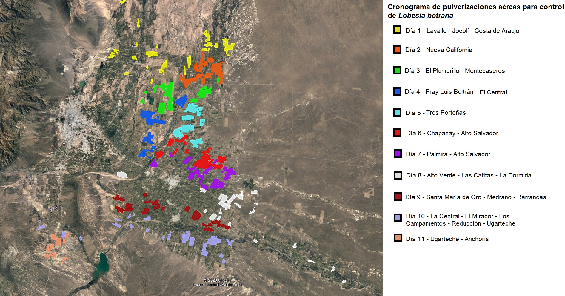 El tratamiento aéreo se llevará adelante en 42.000 hectáreas de los oasis Norte y Este de la provincia. Se utilizarán insecticidas específicos, registrados y autorizados por Senasa, amigables con el medio ambiente y de la categoría toxicológica Clase 4 (banda verde). Los tratamientos serán supervisados por técnicos del Iscamen y del Senasa.