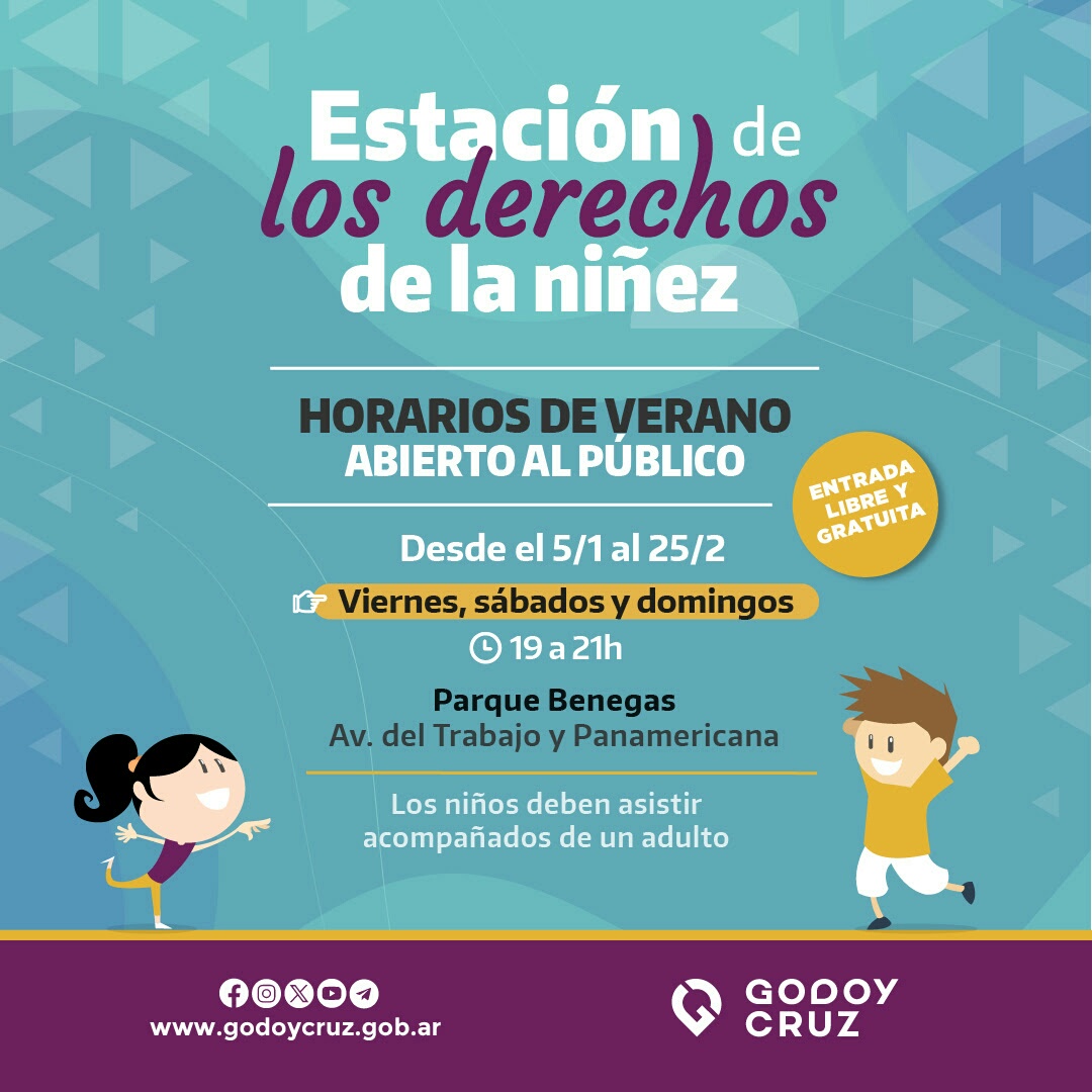 Durante enero y febrero, el horario de visita será viernes, sábado y domingo, de 19 a 21. La Estación de los Derechos de la Niñez está ubicada en el Parque Benegas, San Martín Sur y Avenida del Trabajo