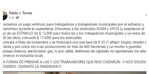 Pablo Torres, intendente de Laprida (Pcia de Buenos Aires) difundió en su Facebook que pagará un bono estímulo a los asalariados municipales y los muembros de la salud. Ese dinero saldrá de un raro impuesto, que será equivalente a un “alfajor Jorgito simple”.