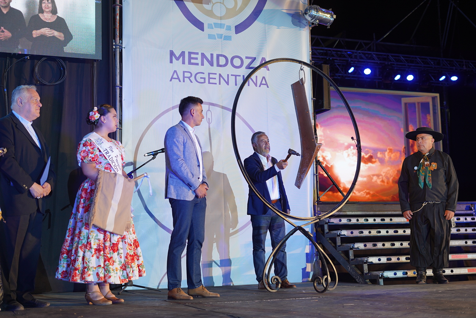 Al culminar la ceremonia religiosa, y acompañado por el intendente de Guaymallén, Marcos Calvente; la reina Ana Laura Verde y la virreina, Gemina Palacios; el presidente de la Federación Gaucha, Fabio Gilberto Reyes, y la flor provincial de la Tradición, Milagros Palacios, el Gobernador Alfredo Cornejo subió al escenario para realizar el golpe de reja.