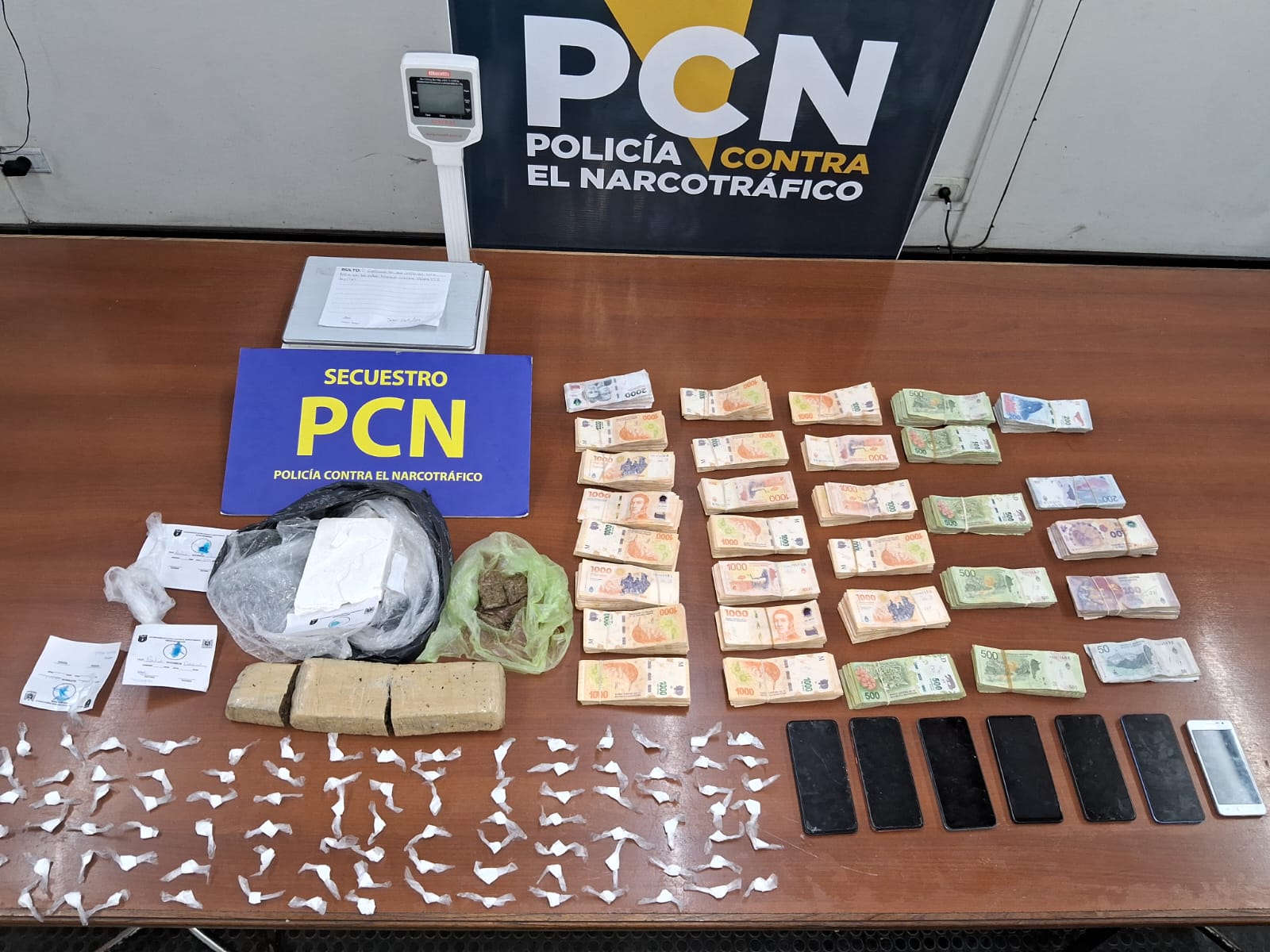 También se procedió al secuestro de cocaína (1 ladrillo por 845 gramos, 3 envoltorios por 70 gramos y 92 envoltorios pequeños por 33 gramos), marihuana (1 ladrillos y cuatro trozos compactados por 990 gramos, 11 gramos en picadura), $ 2.500.000 en efectivo, teléfonos celulares, entre otros.