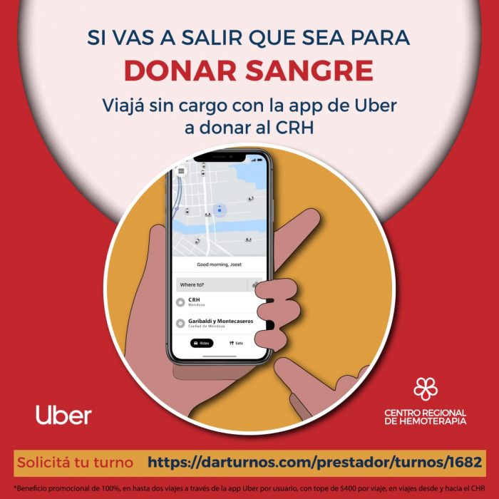 El Ministerio de Salud, Desarrollo Social y Deportes, desde el Centro Regional de Hemoterapia, realizó una alianza con la plataforma Uber. Que permite que los usuarios de la App de Uber que cumplan con los requisitos para donar sangre puedan viajar desde y hacia el Centro de manera gratuita.