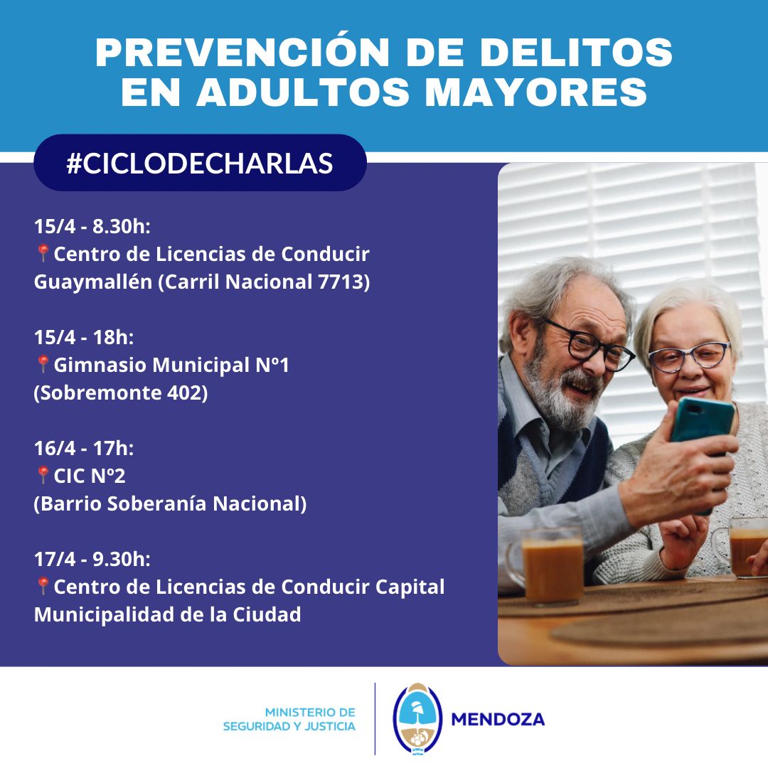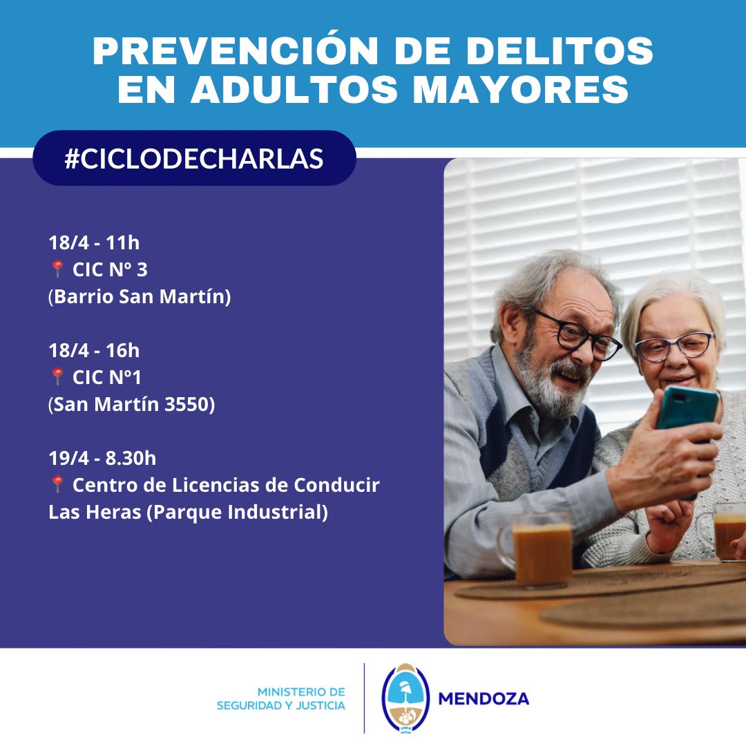 Seguridad y Justicia dará talleres en Ciudad, Las Heras y Guaymallén. Las actividades se realizan a través del programa Prevención de Delitos en Adultos Mayores, dependiente de la Dirección General de Relaciones con la Comunidad, en conjunto con los municipios.