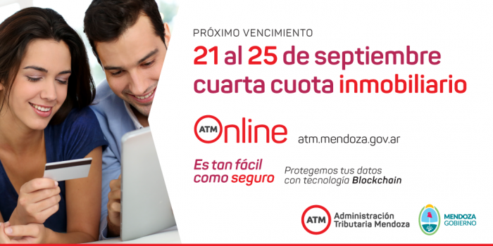 La Administración Tributaria Mendoza (ATM) informó que el plazo para abonar la cuarta cuota del Impuesto Inmobiliario en término es el viernes 25 de septiembre. A través del portal de ATM www.atm.mendoza.gov.ar, los contribuyentes pueden obtener y pagar en línea desde los botones “Descargá Boleto” y “Pagá Online”.
