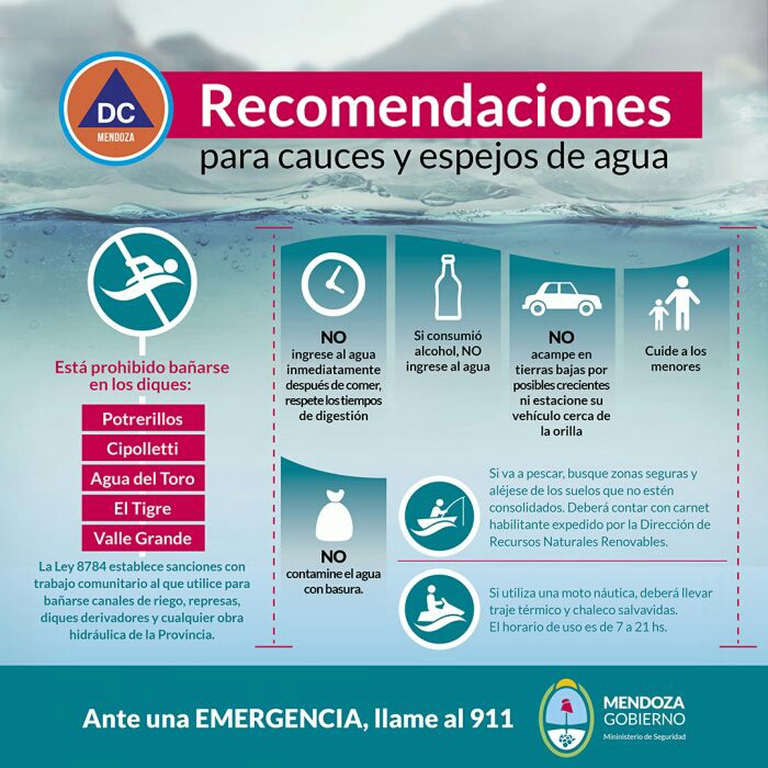 Entre los cuidados, los especialistas recuerdan que está prohibido bañarse en los espejos de agua y cauces que no se encuentren habilitados para ese fin, como Potrerillos, Cipolletti, Agua del Toro, El Tigre y Valle Grande.